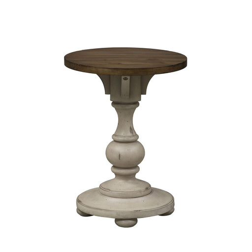 Liberty Furniture River Place Round Chairside Table in Riverstone White & Tobacco