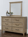 Vaughan-Bassett Passageways Deep Sand Landscape Mirror in Medium Brown 141-447. Landscape mirror crafted from solid wood and beveled glass with a wire brushed waxy brown finish.