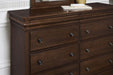 Vaughan Bassett Vista 8-Drawer Dresser in Warm Cherry 770-002. Designed to invoke a sense of nostalgia, Vista presents a classic design with clean gentle lines and timeless elements bathed in a warm cherry finish. Crafted of poplar solids and cherry veneers, this Louie Philippe inspired suite features a felt-lined drawer hidden behind the shaped moulding at the top of the dresser and chest. The storage pieces include burnished brass drawer pulls with smooth finished drawer interiors and self-closing steel ball bearing guides. The sleigh bed offers an old world charm with its shaped bed post and heavy cap rail while the mansion bed drifts towards a more relaxed rustic feel featuring corbel overlays and curved top cap rail.